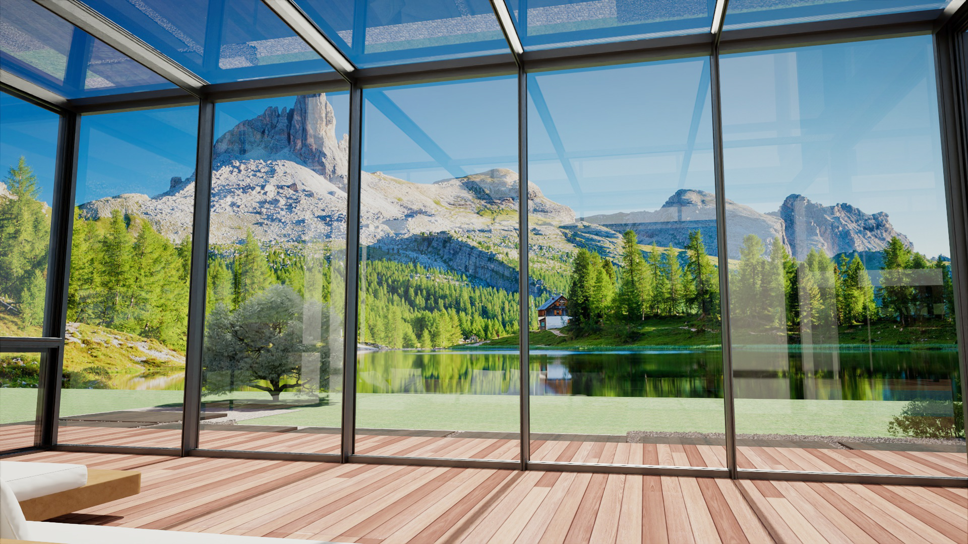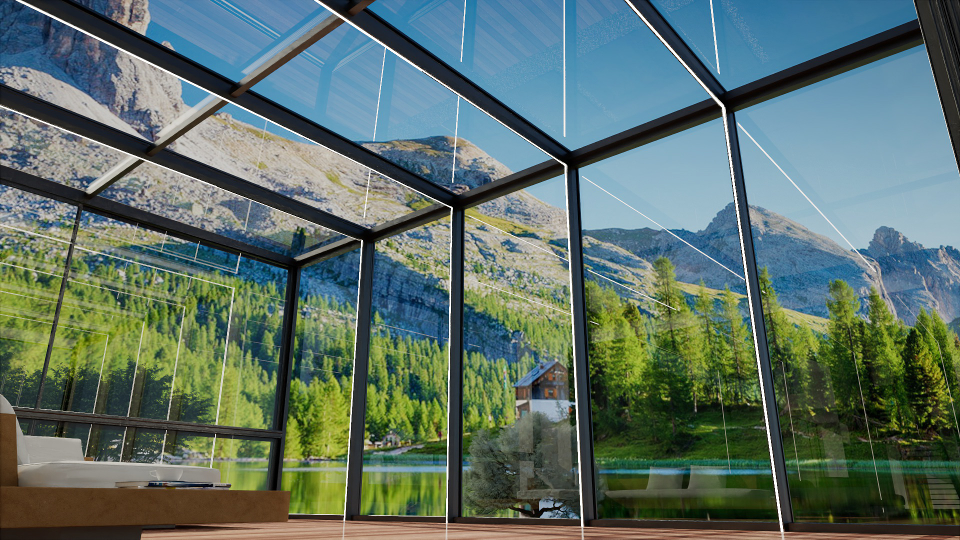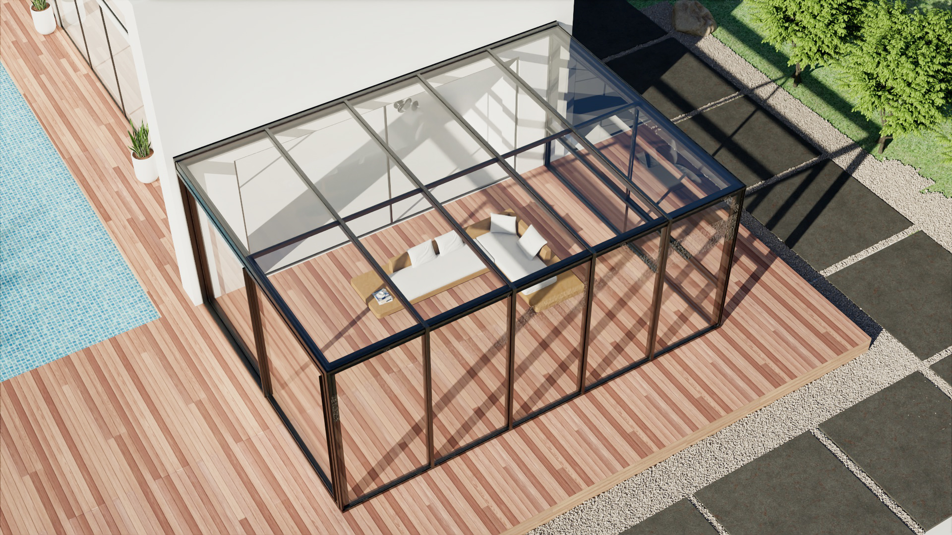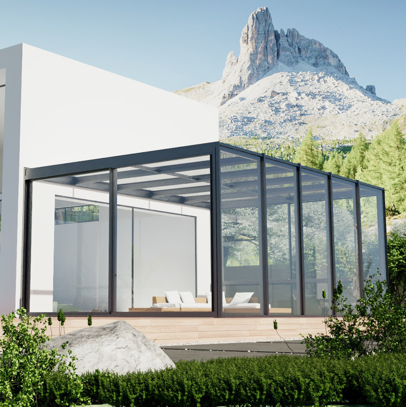 The minimalist sunroom is designed with extreme transparency in mind, using narrow frames and large expanses of glass to create a pure geometric form. The style is restrained, with a palette of black, white, gray, and wood as the primary colors.